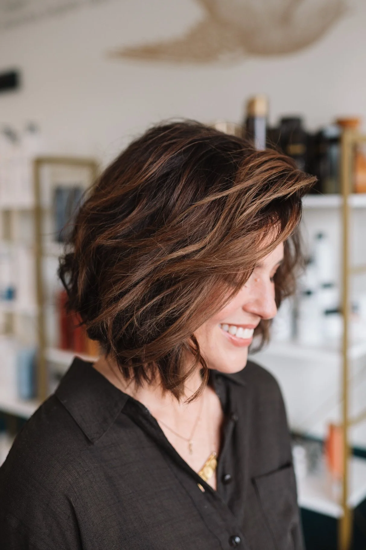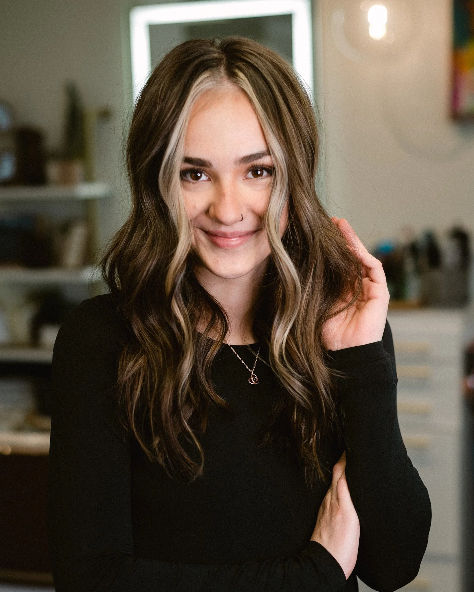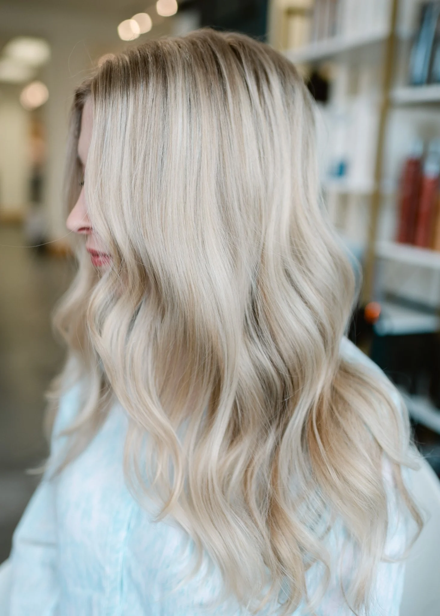 A more monochromatic blonded look with a root shadow (commonly known as a full highlight). This is a technique for clients that want a bright look from roots to ends with a soft grow out. Our clients love our California Blondes for their extreme brightness, blended root, and seamlessly grow out.