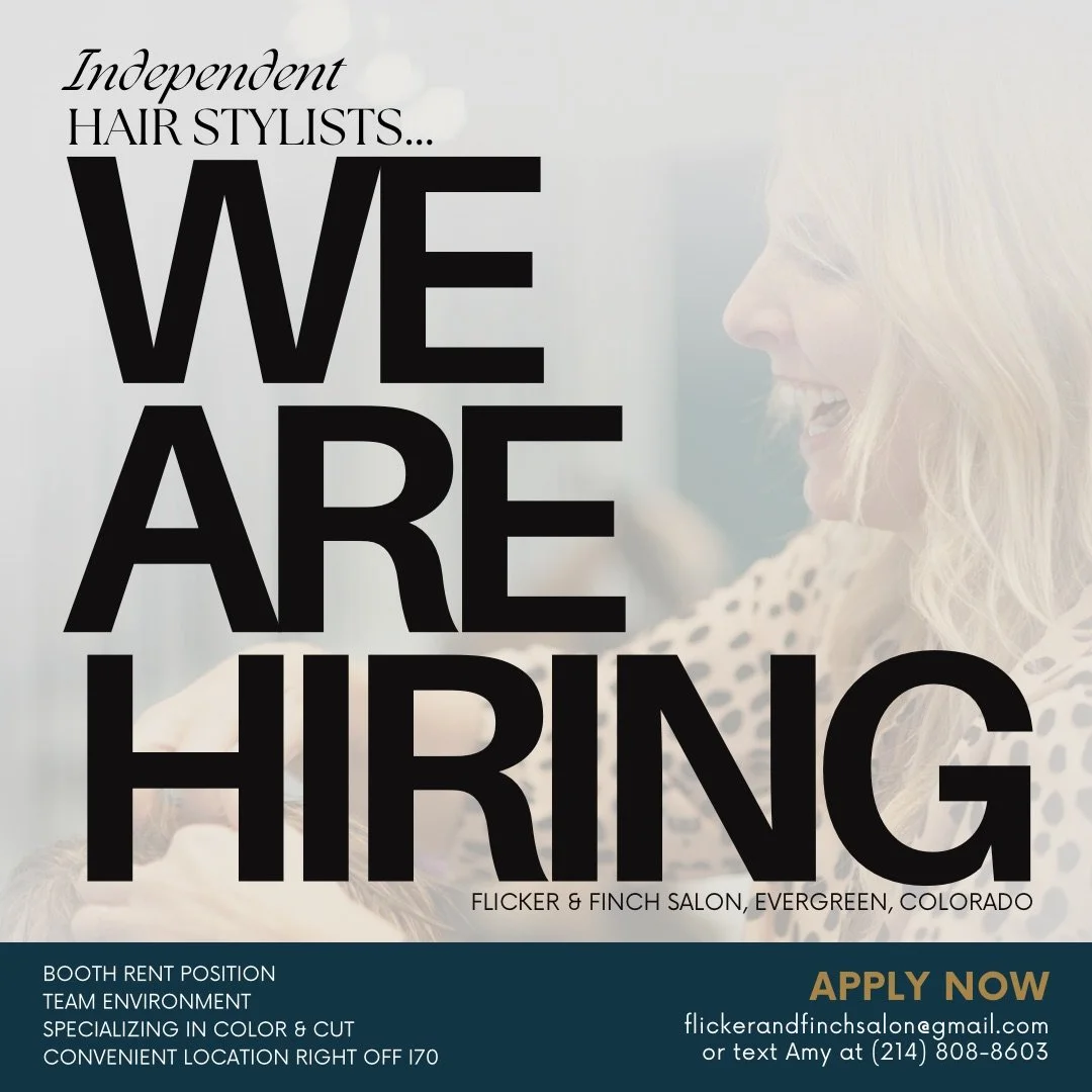 Flicker & Finch Salon is hiring independent hair stylists! 💁🏼♀️ Come join our family of super fun and professional stylists in our beautiful and modern Evergreen, Colorado salon.